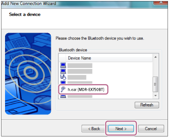 - Odaberite [h.ear (MDR-EX750BT)] na zaslonu [Select a device], a zatim kliknite [Next].