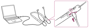 - Jei ausinės ilgą laiką buvo nenaudojamos, indikatorius (raudonas) gali neužsidegti, kai norėdami įkrauti ausines prijungsite kabelį su mažąja USB jungtimi. Tokiu atveju neatjunkite kabelio su mažąja USB jungtimi nuo ausinių: palaukite kelias minutes, kol užsidegs indikatorius (raudonas).