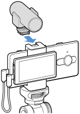 Richten Sie den Mikrofonfuß am Zubehörschuh an der Halterung aus und bringen Sie das Mikrofon an.