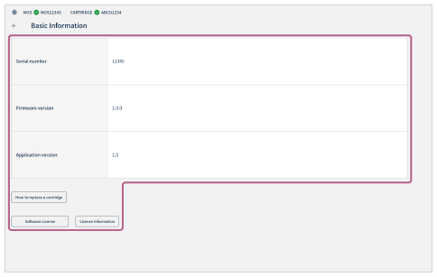 Überprüfen Sie die Seriennummer des Geräts, die Firmware-Version, die Version der App „Scent Canvas“ usw.