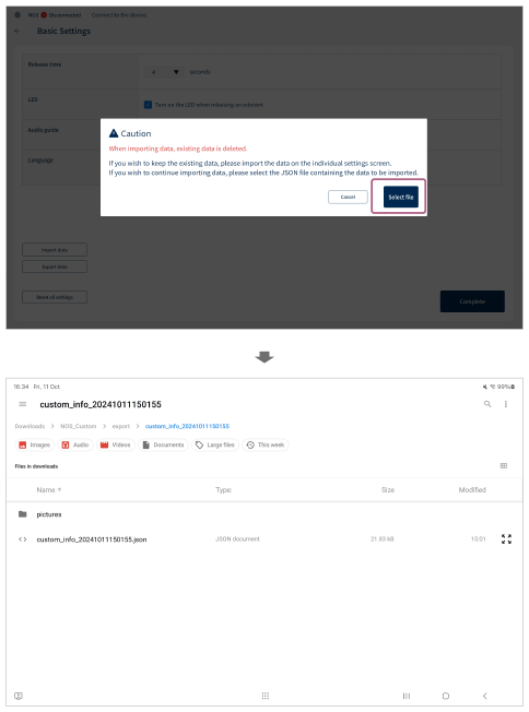 Confirm the caution message on the screen, and tap [Select file] to select the JSON file in the “custom_info_yyyymmddhhmmss” folder that you copied in step 6.