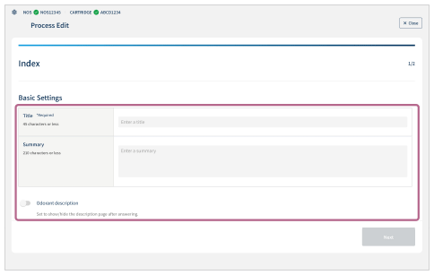 - Toque [Crear] en la sección [Índice] de la pantalla [Creación de proceso].