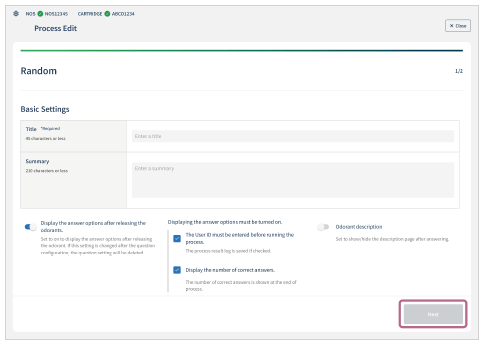 (activado/desactivado) para configurar. Si se activa, se muestran las opciones; si se desactiva, se pasa a la siguiente pregunta. - Debe introducirse el ID de usuario antes de ejecutar el proceso.: esta opción se puede configurar si se activa [Mostrar las opciones de respuesta después de liberar los olores.]. Si se selecciona la casilla, es necesario introducir el ID antes de ejecutar el proceso, y se puede verificar el registro de resultado del proceso después de contestar.