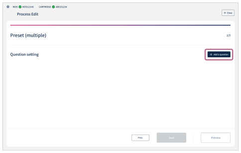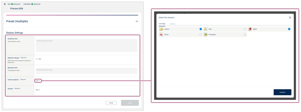 (Eliminar) cuando quiera eliminar un olor añadido. Configure dos o más candidatos (se pueden establecer 5 como máximo). - Texto de pregunta: escriba el texto de la pregunta (máximo 75 caracteres).