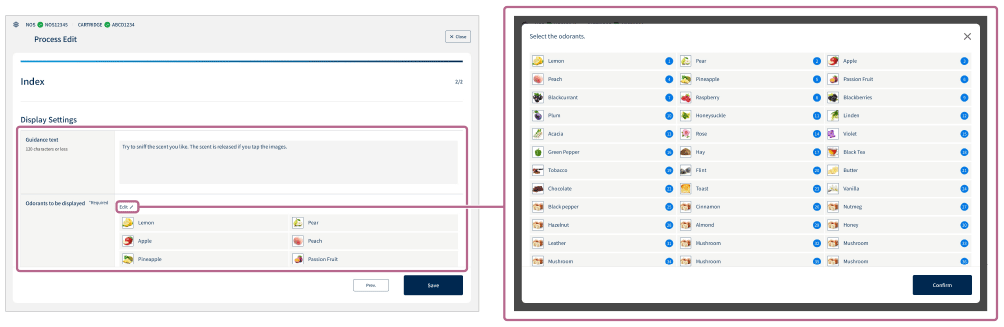 ] pour afficher l’écran de sélection des odeurs. Sélectionnez les odeurs sur l’écran de sélection des odeurs et appuyez sur [Confirmer].