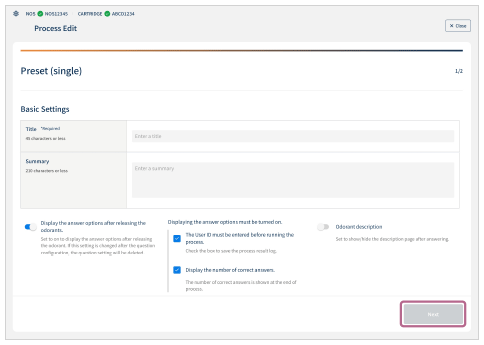 - Afficher le nombre de réponses correctes. : Cette option peut être définie si [Afficher les options de réponse après avoir libéré les odeurs.] est activé. Lorsque la case est cochée, le nombre de réponses correctes s’affiche.
