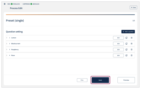 (Activer/Désactiver) pour définir d’afficher ou non les choix de réponse après la libération de l’odeur. - L’ID utilisateur doit être saisi avant d’exécuter le processus. : Cette option peut être définie si [Afficher les options de réponse après avoir libéré les odeurs.] est activé. Lorsque la case est cochée, la saisie de l’ID est requise avant l’exécution du processus et le journal des résultats du processus peut être vérifié après avoir répondu.