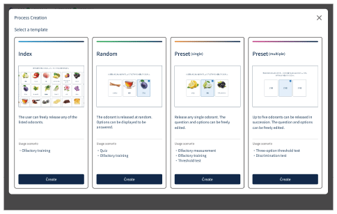È possibile utilizzare i modelli per personalizzare i dettagli e il metodo di rilascio dell’odorante e creare un processo su misura per l’applicazione (file di impostazione che riassume le condizioni di rilascio degli odoranti).