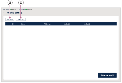Operazione di esportazione: Mentre sono visualizzate le [Impostazioni ID utente] che si desidera copiare, toccare [Genera CSV]. Il file CSV “ID_registered_list_aaaammgghhmmss.csv” verrà salvato nella directory nella cartella “Download”.