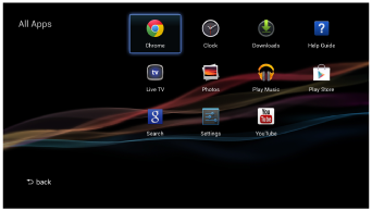 This screen displays all applications installed on the Smart Stick. The All Apps list is displayed in alphabetical order and includes shortcuts to websites. See the list of applications in “Enjoying Content & Apps” for the list of pre-installed applications. You can also access [Settings] from this screen.