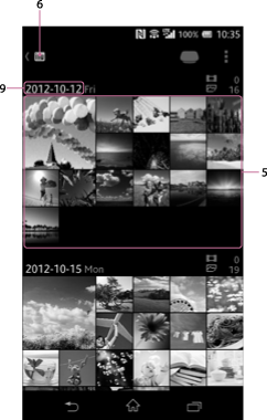 De miniatuur van het eerste beeld wordt voor elke datum weergegeven. Tik op een datum om het miniatuurlijstscherm voor die datum te openen.