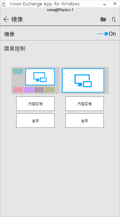通过在Vision Exchange App.中按下[内容区域]或[全屏],可以选择在内容区域中或全屏模式下显示镜像视频。