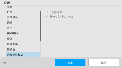 当启动视频会议时,使用此项选择要使用的模式([H.323/SIP]或[Skype for Business])。