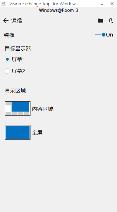 通过在Vision Exchange App.中按下[内容区域]或[全屏],可以选择在内容区域中或全屏模式下显示镜像视频。