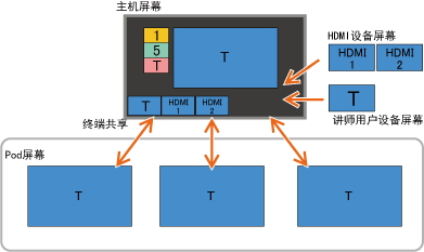 * 选择终端共享区域中显示的Pod内容将会调用参加成员组的演示。始终在缩略图区域中选择内容。