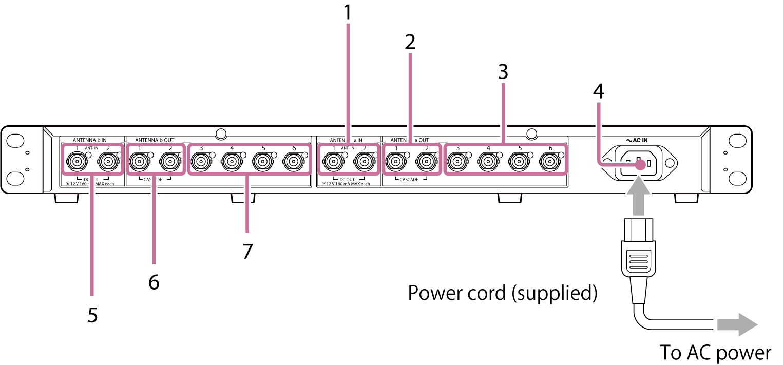Inputs the signal from the antenna via a coaxial cable and simultaneously supplies power to the antenna side to drive the antenna booster. Use the ANTENNA b DC OUT switch on the front panel to switch between 9 V/THRU/12 V. You can connect up to two antennas according to the range of your wireless microphone.