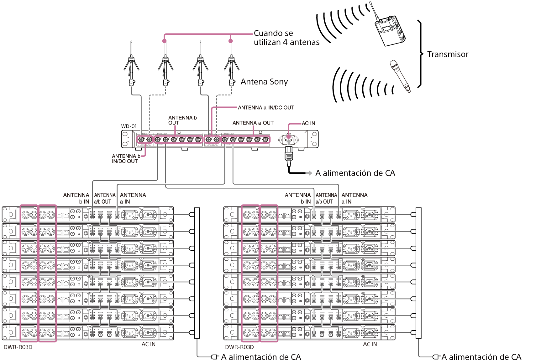 Hay dos unidades DWR-R03D conectadas directamente a esta unidad y otras 14 más conectadas mediante la salida en cascada de las unidades DWR-R03D.