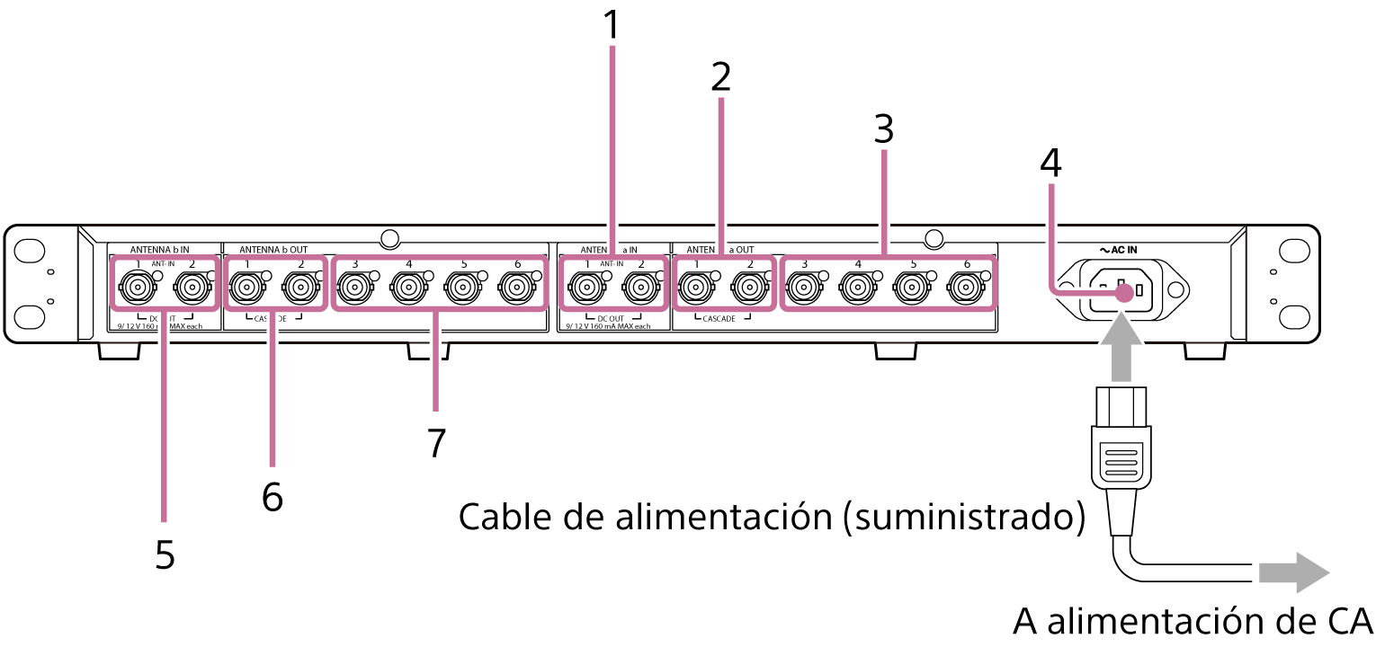 Recibe la señal de la antena a través de un cable coaxial y, al mismo tiempo, suministra alimentación al lado de la antena para accionar el amplificador de antena. Utilice el interruptor ANTENNA b DC OUT del panel frontal para cambiar entre 9 V/THRU/12 V. Es posible conectar hasta dos antenas en función del alcance del micrófono inalámbrico.