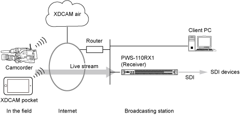 This is a system configuration that receives streaming video using a PWS-100RX1/110RX1/110RX1A, where the connection is managed by the XDCAM air service.