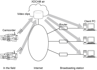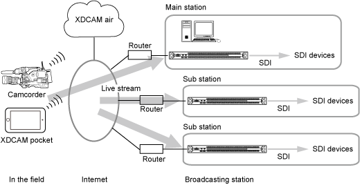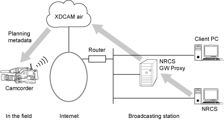 This topic shows a system configuration example for live streaming using XDCAM air, and a system configuration example for sending shooting plans generated in a Newsroom Computer System (NRCS) to a camcorder.