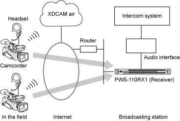 This is a system configuration in which operation of the internal intercom of the broadcast station and XDCAM air are used in conjunction when using a camcorder that has an intercom function.