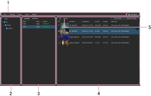 - Proxy Transfer button: Adds the proxy file for the selected file to the transfer job list. Files are transferred to the server specified in [Upload Server] in XDCAM air. The transferred files are also saved in the [Auto Upload] bin on the Asset screen in the same way as when using the camcorder Auto Upload function. Selection of the transfer destination in the GUI is not required.