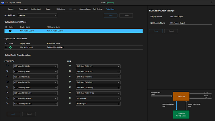 You can assign up to 8 audio tracks (16 ch) to the PGM/PVW output and CLN output. The pull-down lists show the NDI input audio tracks from an external audio mixer. Select the audio tracks for the PGM/PVW output and CLN output, and press the [Apply] button.