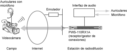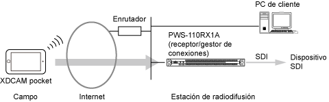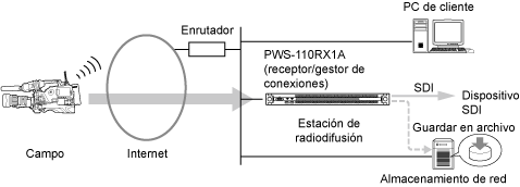Aquí se muestra un sistema a pequeña escala que solo utiliza una unidad PWS-110RX1A. La unidad PWS-110RX1A actúa como receptor y como gestor de conexiones de la transmisión en tiempo real.