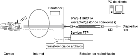 Puede transferir archivos de vídeo (clips) almacenados en una tarjeta SD en la videocámara a un servidor FTP. Configure el servidor FTP en la misma red de la unidad PWS-110RX1A, como se muestra a continuación.