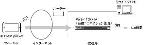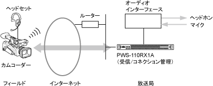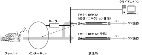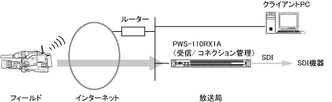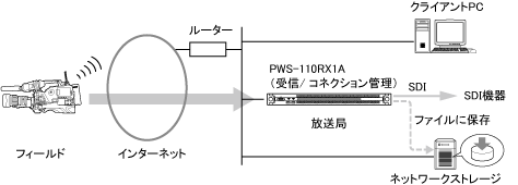 PWS-110RX1Aを使ってライブストリーミングを行うシステムの構成例を示します。
