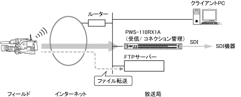 カムコーダーのSDカードに保存されているクリップ(映像ファイル)をFTPサーバーに転送できます。下記のように、PWS-110RX1Aと同じネットワーク上にFTPサーバーを設置します。