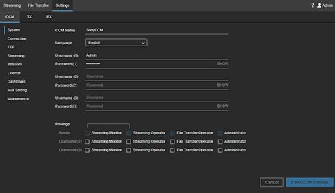 - 사용자 이름 (1) / 사용자 이름 (2): 캠코더에서 Connection Control Manager에 로그인할 때 사용할 사용자 이름을 입력합니다. 두 명의 사용자를 구성할 수 있습니다.