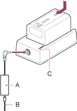 - Liitä verkkolaite (A) akkulaturiin ja kytke virtajohto (B) vaihtovirtalähteeseen.