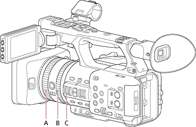 | [Focus, IRIS] | Regola manualmente la messa a fuoco utilizzando la ghiera di messa a fuoco (A). Regola il diaframma utilizzando la ghiera dello zoom (B). |
