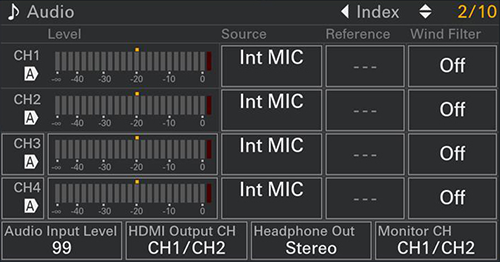 Trykk på AUDIO-knappen for å vise [Audio]-statusskjermen. Du kan også trykke på MENU-knappen (meny) og bla på skjermen for å vise statusen.