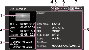 Nome del clip, formato di registrazione, modalità di registrazione speciale, nome del dispositivo di memorizzazione, informazioni sulla firma digitale