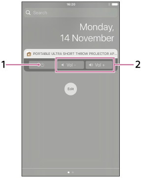 Meddelandet ”Portable Ultra Short Throw Projector Application” visas på meddelandeskärmen på din smartphone, när din smartphone är ansluten till projektorn. Med detta meddelande kan du växla mellan nätverksstandbyläge och påslaget läge samt justera volymen för projektorn.