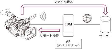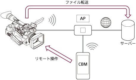 モバイル端末をアクセスポイント(AP)にして、カムコーダーをリモート操作およびカムコーダーからサーバーへファイルを転送します。