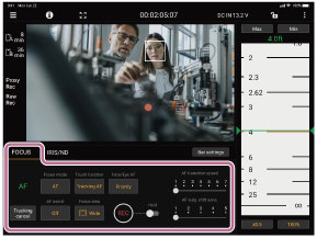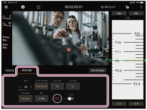 [IRIS/ND]タブをタップし、表示される各項目を設定してアイリス/NDフィルターを調整できます。本アプリでアイリスの操作を行うには、レンズのアイリスリングを「A」ポジションにする必要があります。各項目について詳しくは、カムコーダーの取扱説明書をご覧ください。