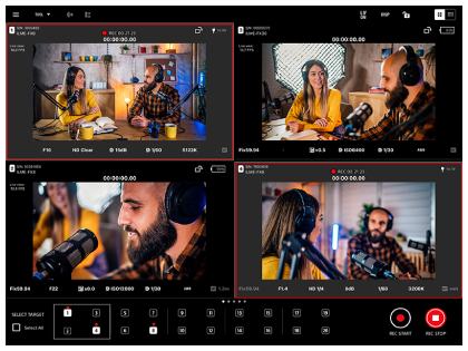 - Beim Zeitverlauf von Aufnahmestart/-stopp kann es zu leichten Verzögerungen zwischen den Zielkameras kommen.