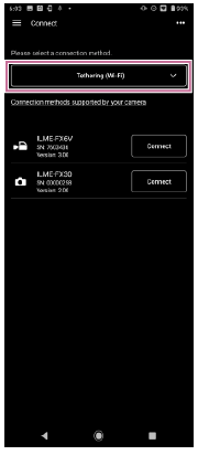: 연결 화면에서 [Tethering (Wi-Fi)]*를 선택합니다.* Android의 경우 [Tethering (Wi-Fi)]가 표시됩니다. iOS/iPadOS의 경우 [Tethering (Wi-Fi/USB)]가 표시됩니다.