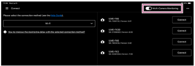Po nawiązaniu połączenia z kamerą przy użyciu metody łączenia obsługiwanej przez kamerę włącz funkcję monitoringu wielu kamer, postępując zgodnie z poniższą procedurą.