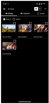 Dotknij karty [Proxy], aby wyświetlić klipy nagrywania pomocniczego. Dotknij karty [Original], aby wyświetlić oryginalne klipy. Dotknij karty [Local], aby wyświetlić klipy nagrywania pomocniczego zaimportowane do urządzenia sterującego.