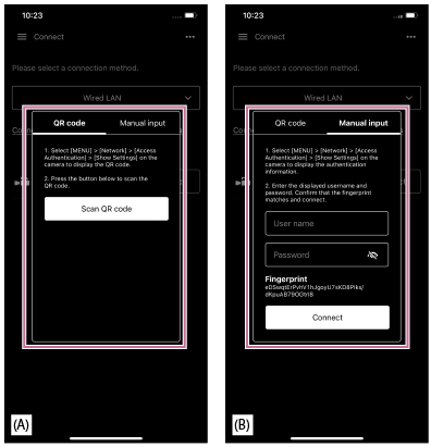 第一次連線時,需要存取驗證設定才能啟用與攝影機進行的加密通訊。您輕按要連線的攝影機時,下列存取驗證畫面上會提示您輸入使用者名稱和密碼或掃描 QR 碼。