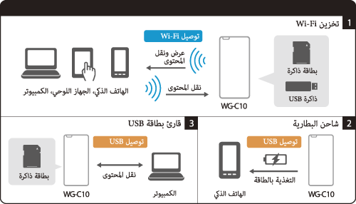 يمكنك أيضا نسخ البيانات بين بطاقة ذاكرة مدخلة في هذه الوحدة وجهاز موصول بهذه الوحدة عبر USB أو جهاز (هاتف ذكي، كمبيوتر لوحي، كمبيوتر) تشغل به هذه الوحدة.