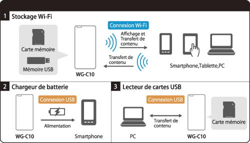 Vous pouvez copier des données entre une carte mémoire insérée dans cet appareil, un périphérique raccordé à cet appareil via USB et un périphérique (smartphone, tablette, ordinateur) grâce auquel vous utilisez cet appareil.