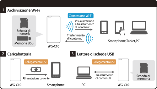 È possibile copiare i dati tra una scheda di memoria inserita nell’unità, un dispositivo collegato all’unità tramite USB o un dispositivo (smartphone, tablet o computer) attraverso il quale viene gestita la presente unità.