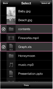 U kunt meerdere bestanden/mappen selecteren. Tik op [Alles selecteren(Select all)] om alle weergegeven bestanden/mappen te selecteren.