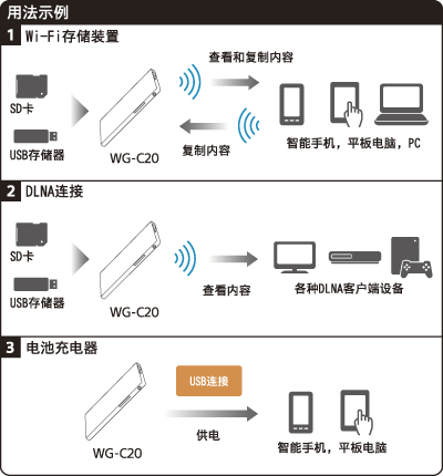 可以将本装置作为M-DMS(移动式数字媒体服务器)访问,并且可以在其他DLNA认证设备(电视机、电脑、智能手机等)上查看SD卡或与本装置相连的USB设备中的文件(照片、音乐、视频)。
