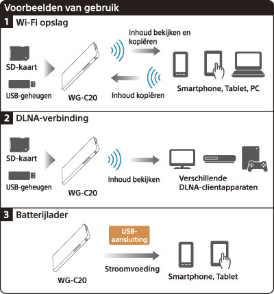 Door gebruik te maken van de functie voor draadloos LAN, kunt u bestanden (foto's, muziek, video's, documenten) weergeven die opgeslagen zijn op een SD-kaart geplaatst in dit apparaat of in een toestel dat aangesloten is via USB, op een smartphone, op een tablet of op een computer.